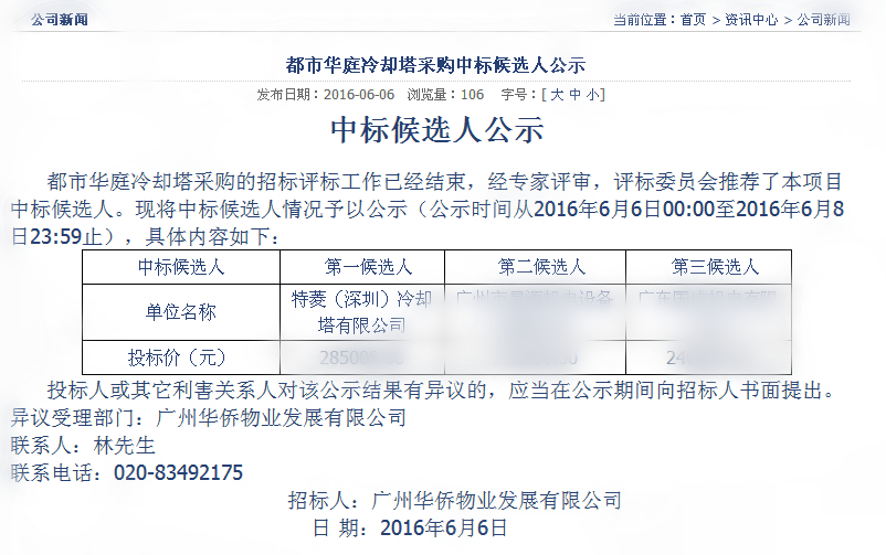 第三方官網(wǎng)公布冷卻塔中標(biāo)信息:
