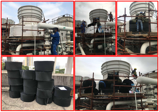 鴻翔花園位于深圳老城區(qū)之一的羅湖蔡屋圍區(qū)松園路。由于冷卻塔使用壽命長(zhǎng),冷卻塔填料老化,需要更換冷卻塔填料。接下來(lái),根據(jù)鴻詳花園圓形冷卻塔填料的更換,介紹了拆卸和更換圓形冷卻塔填料的正確過(guò)程。 在清除