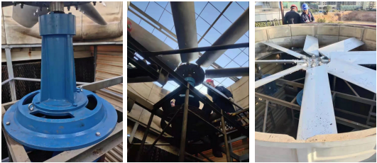 安裝新的冷卻塔超靜音風(fēng)機,拆掉出風(fēng)口消聲器 更換新的冷卻塔不銹鋼接水盤
